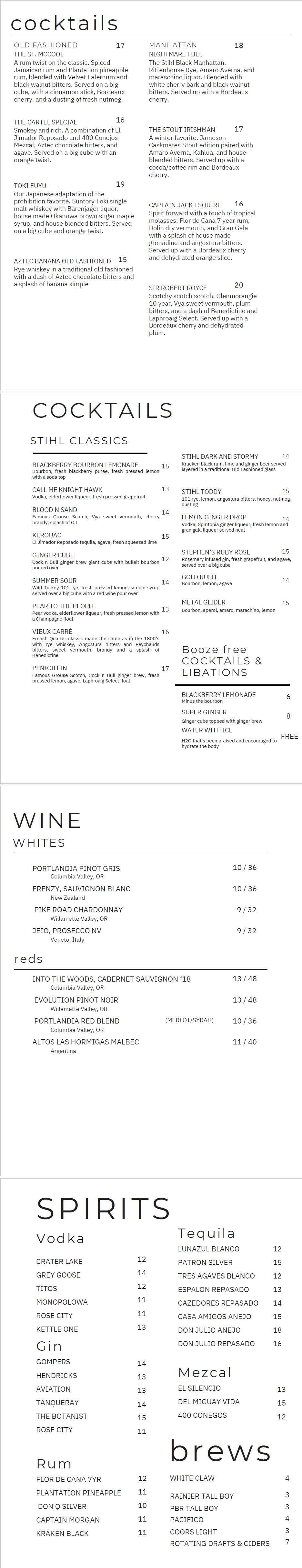 Stihl Whiskey Bar Cocktails, Wine and Spirits Menu: