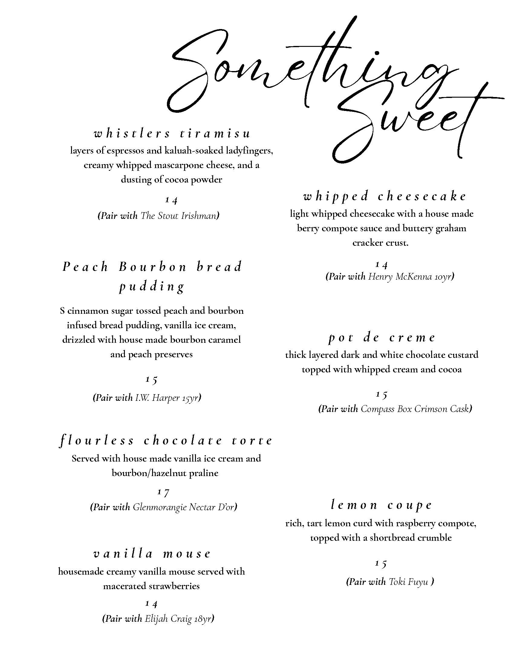 Stihl Whiskey Bar Cocktails, Wine and Spirits Menu: